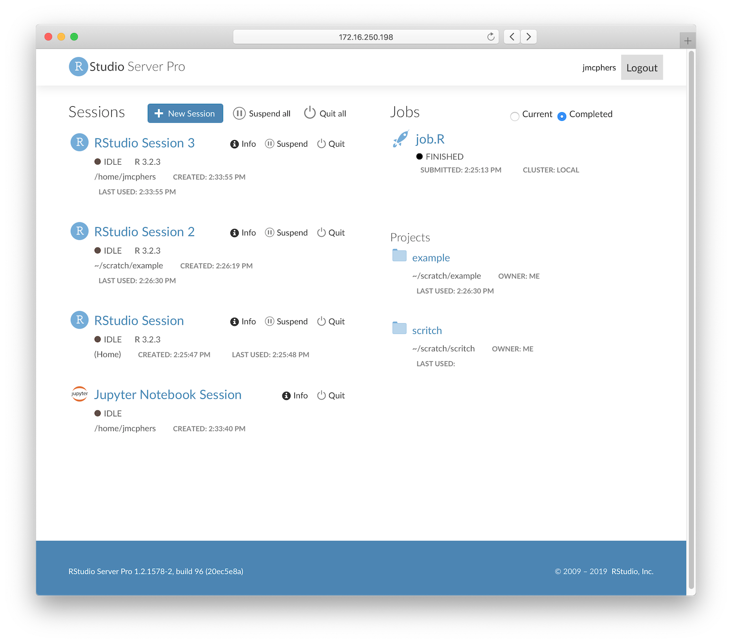 In addition to adding these two new capabilities, we’ve revamped the RStudio Server Pro user dashboard (homepage), with cleaner visuals and a clearer layout. You’ll see a summary of all your active sessions and jobs, quick links to your active projects, and tools for managing ongoing work.