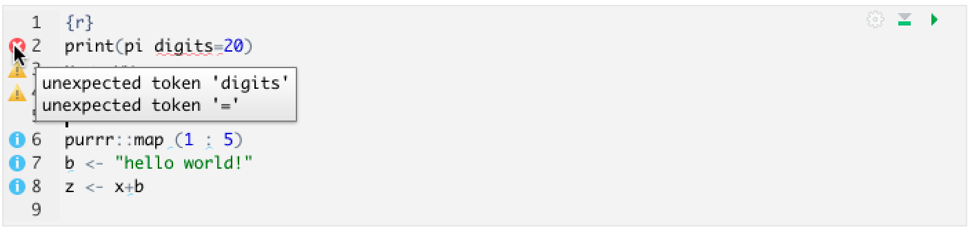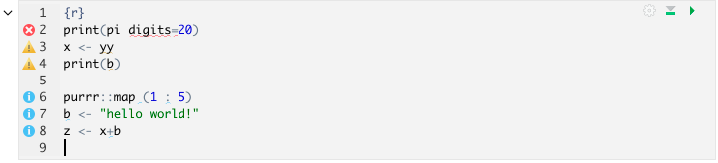 For example, in the code sample below, issues are denoted with diagnostic markers next to the line numbers, and for certain issues, the affected code is underlined.
