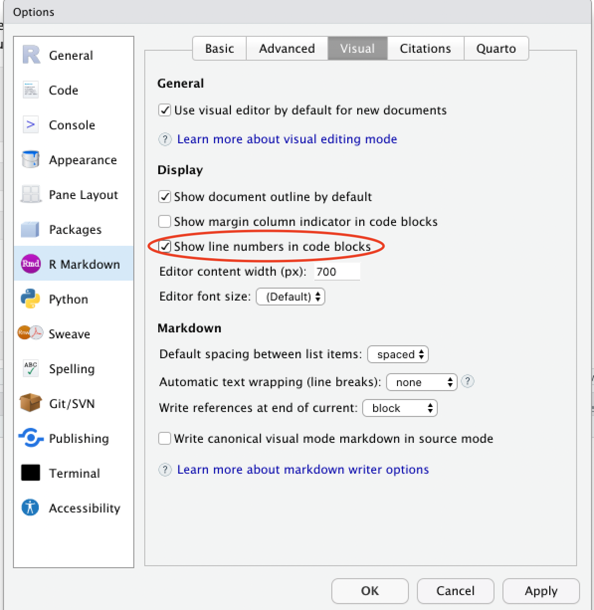 Users now have the option to display line numbers, code diagnostic markers, or both in the left-hand margin of each code chunk in the visual editor.