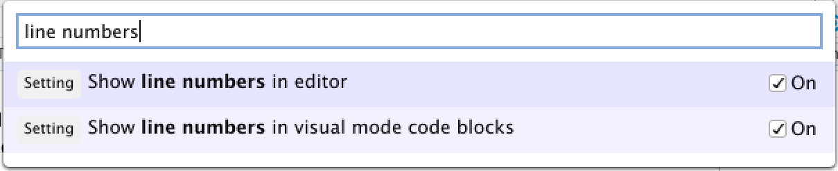 Alternatively, you can also enable line numbering by opening the Command Palette and searching for “line numbers” to check the setting “Show line numbers in visual mode code blocks”.