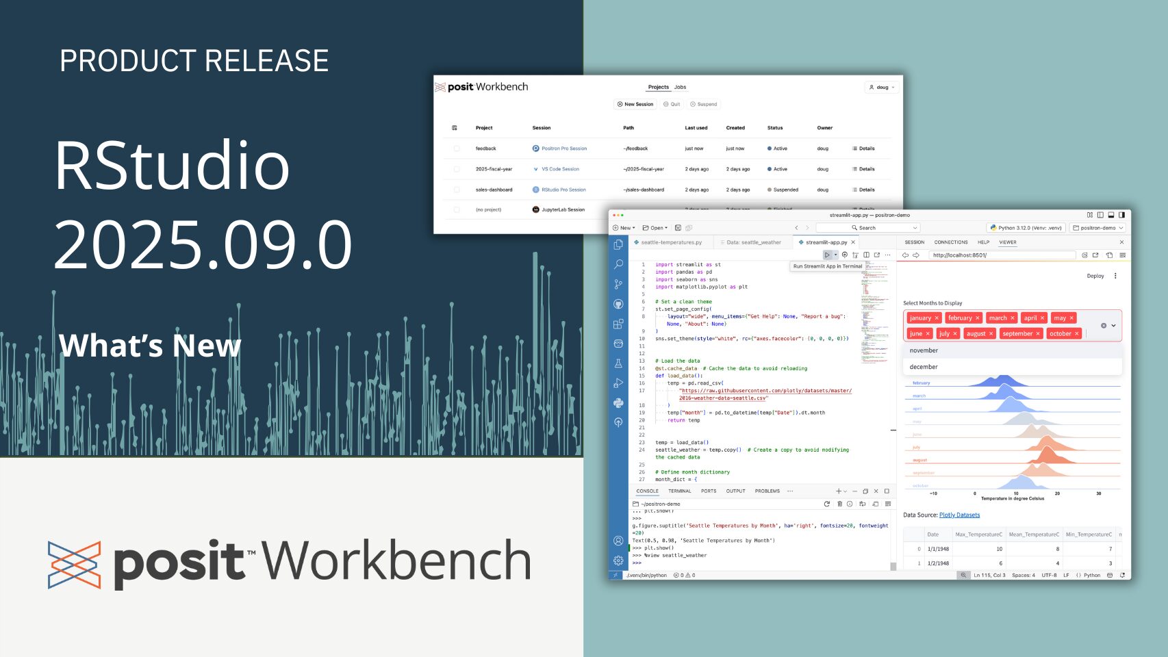 There’s a lot more in this release, and it’s available for download today. You can read about all the features & bug fixes in the Posit Workbench and RStudio 2025.09.0 “Cucumberleaf Sunflower” release in the RStudio/Posit Workbench Release Notes. We’d love to hear your feedback about the new release on our community forum.
