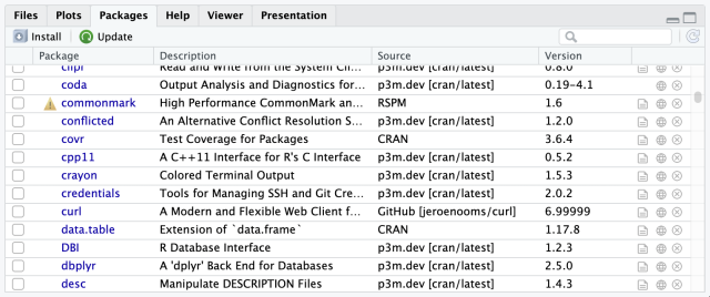 RStudio desktop, RStudio server, and RStudio Pro on Workbench will now optionally display CVE-related metadata in the Packages pane when configured against Posit Package Manager. This helps developers make safer package choices at a glance and helps IT teams simplify security reviews. For example, version 1.6 of the commonmark package has a number of known vulnerabilities. If that version of the package is installed, RStudio displays a small warning icon in the Packages table for that package: