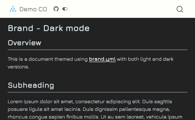 - Dark Brand: Light and dark brands can be specified for a document or project, enabling dark mode via brand.yml.