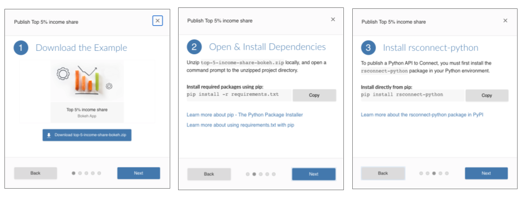 For a hands-on approach to learning about Python content in RStudio Connect, try exploring the Jump Start examples. The Jump Start examples now contain tutorials for Bokeh and Streamlit application publishing under the Python tab.