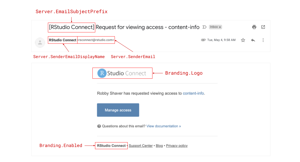 Emails sent from RStudio Connect are now highly customizable. The example below is a “Request for viewing access” notification email sent to a content owner. Each of the areas highlighted below are values that can be controlled through configuration settings: