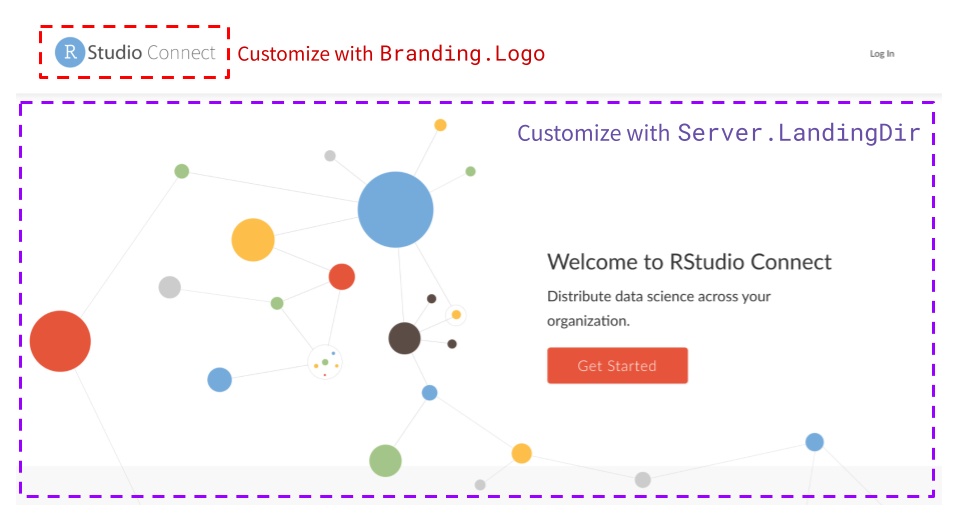 The page that anonymous and logged-out users see when they visit RStudio Connect can be customized with Server.LandingDir. This setting takes a path to a directory containing the index.html page you’d like to serve in place of the “Welcome to RStudio Connect” page you see below: