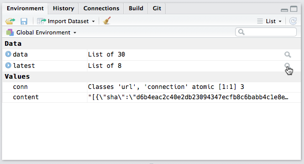 The same workflows you’re familiar with for opening the data viewer apply when opening the object explorer. Let’s start by inspecting some data returned by the GitHub API – we’ll inspect the latest commit made on the dplyr repository. First, let’s start by downloading and reading this data into R: