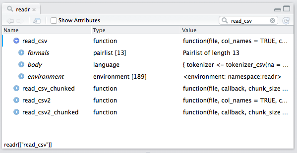 Notice how the object explorer displays the formals, body and environment for an R function definition. This allows you to explore the ‘guts’ of an R function – for example, the expression tree associated with a function’s body, and the default parameter values associated with the function arguments. We can expand the formals entry to view the function arguments accepted by read_csv():