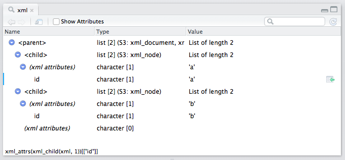 The object explorer also comes with special handling for XML and HTML documents produced by the xml2 package: