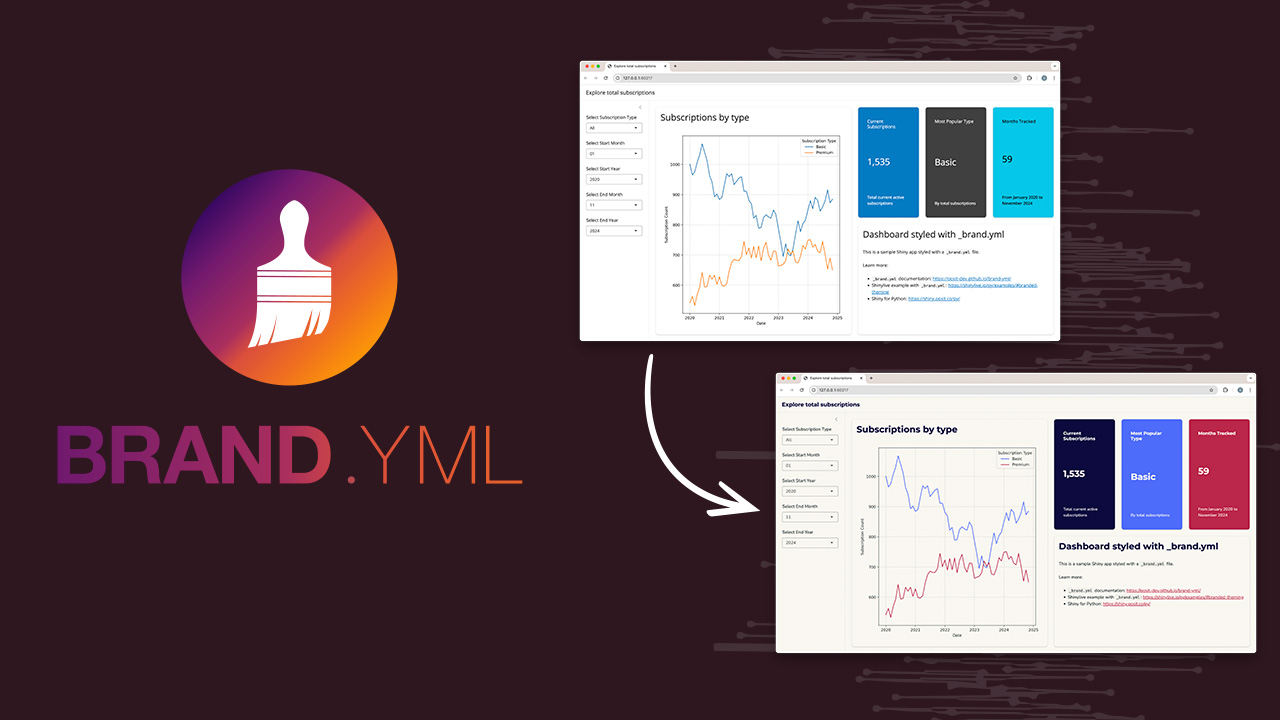 brand.yml enables unified branding for your dashboards, reports, and apps with a single file. Define your brand once and apply it seamlessly across projects, avoiding numerous manual updates and inconsistencies. Learn more and get started at https://posit-dev.github.io/brand-yml/.