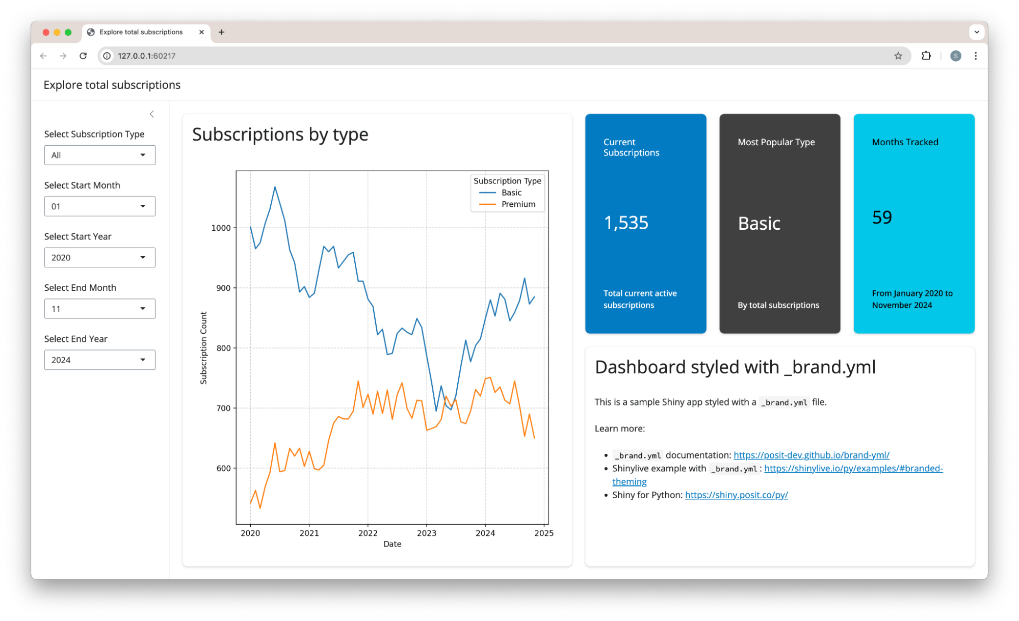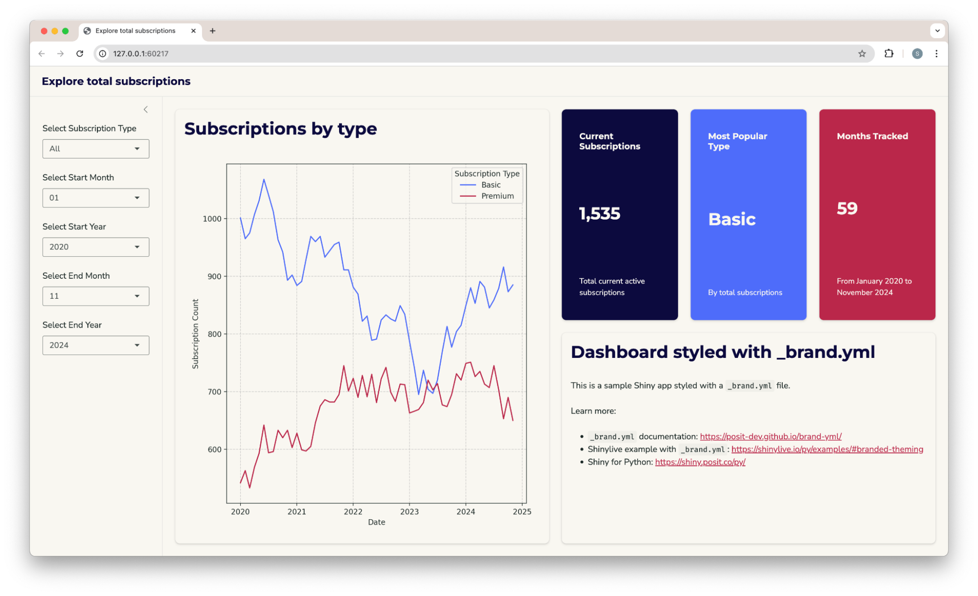 Now, we can place our _brand.yml file in the directory of a Shiny app or Quarto document to apply the specified branding. Currently, _brand.yml can be used by Quarto 1.6 and Shiny for Python.