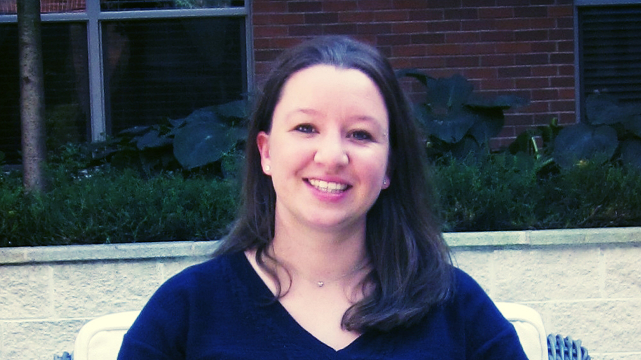 portrait of smiling Rachael Dempsey standing in front of off-white wall