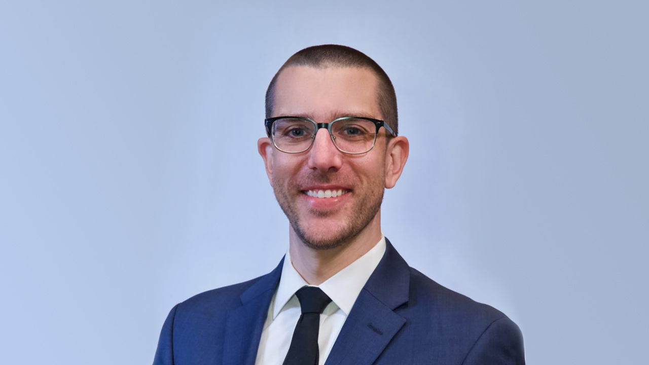 portrait of Justin Elszasz in front of solid light blue background