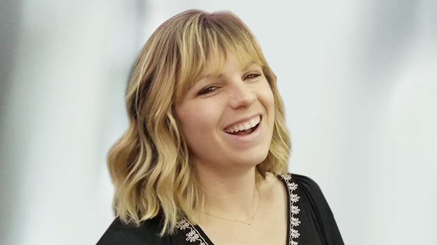 portrait of smiling Rachael Dempsey standing in front of off-white wall