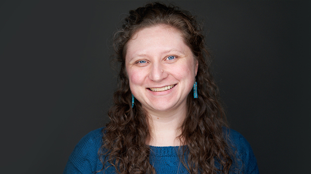 portrait of smiling Rachael Dempsey standing in front of off-white wall