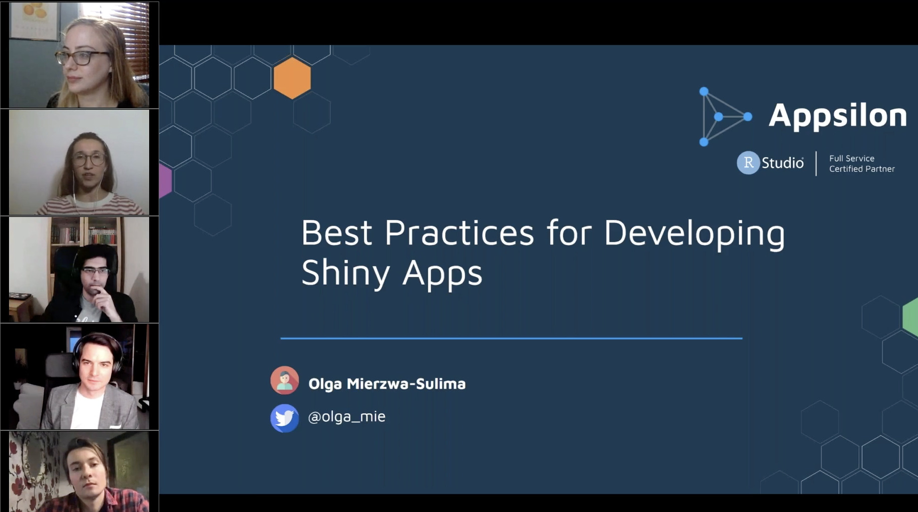 Best practices for developing Shiny apps presentation covers organizing app's code with modules and R6 classes, setting up development environment, and testing.