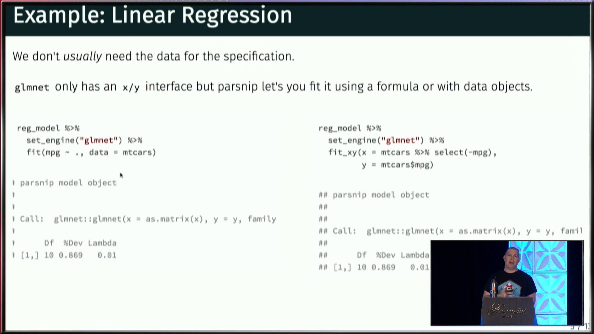 parsnip is a new tidymodels package that generalizes model interfaces across packages. The idea is to have a single function interface for types of specific models (e.g. logistic regression) that lets the user choose the computational engine for training. For example, logistic regression could be fit with several R packages, Spark, Stan, and Tensorflow. parsnip also standardizes the return objects and sets up some new features for some upcoming packages.