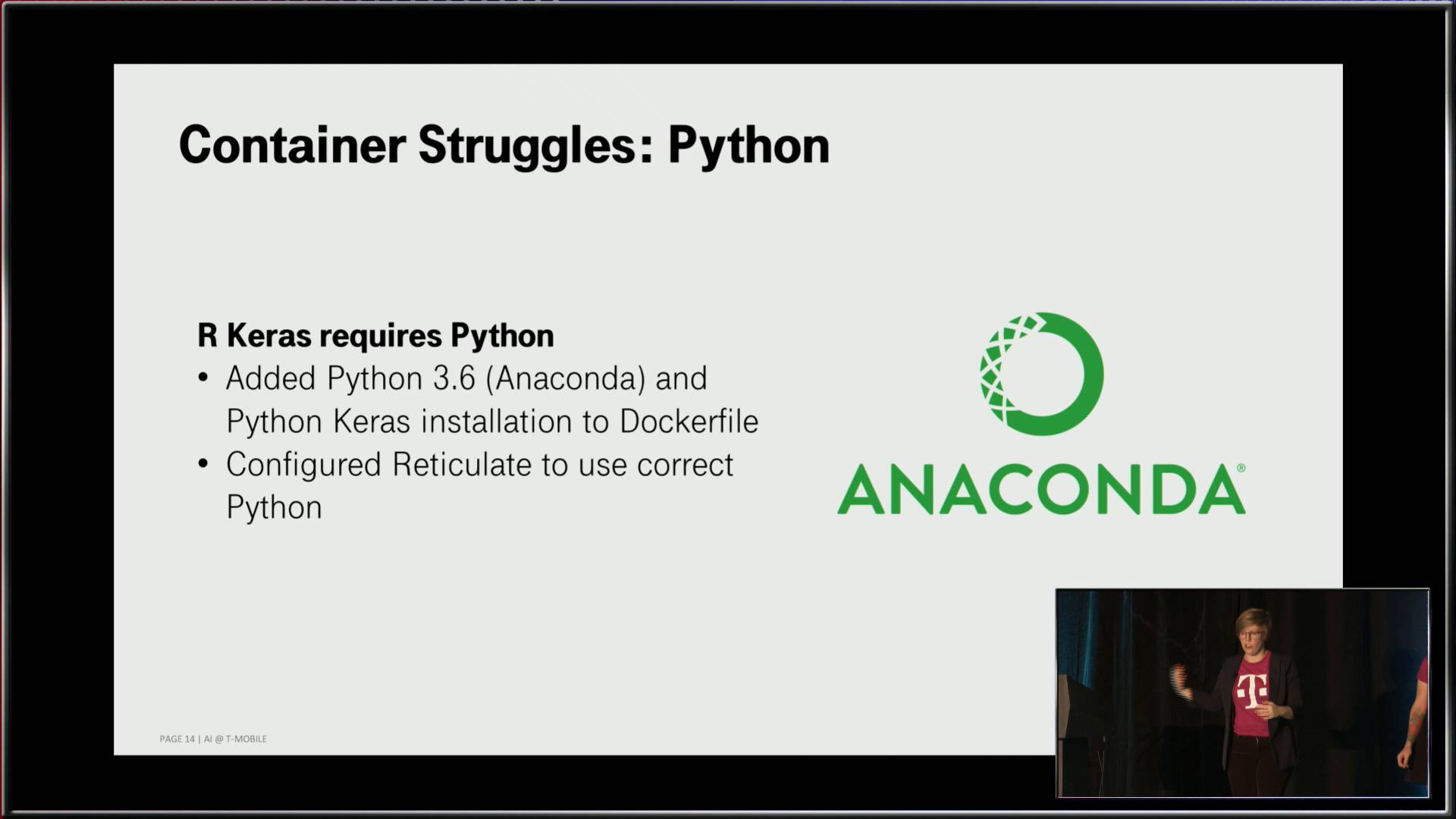When tasked with creating the first customer-facing machine learning model at T-Mobile, we were faced with a conundrum. We had been told time and time again to deploy machine learning models in production you had to use Python, but our very best data scientists were fluent in building neural networks in R with Keras and TensorFlow. Determined to avoid double work, we decided to use R in production for our machine learning models. After months of work, wrangling our containers to meet cloud security compliance, and conforming to DevOps standards, we succeeded in creating a containerized API solution using the keras and plumber R packages and Docker. Today R is actively powering tools that our customers directly interact with and we have open sourced our methods. In this talk, we'll walk through how to deploy R models as container-based APIs, the struggles and triumphs we've had using R in production, and how you can design your teams to optimize for this sort of innovation.