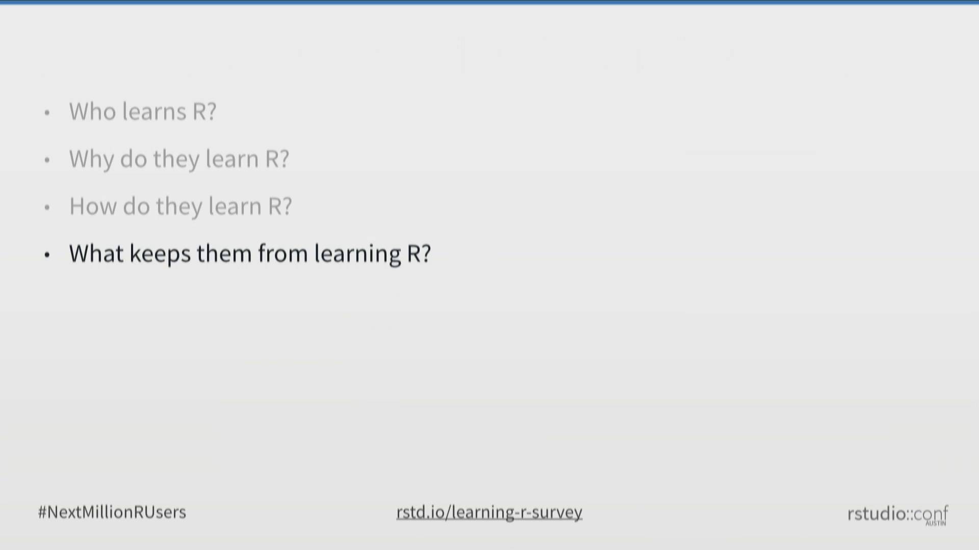 Many students believe that R is obscure, complex, and difficult to write. However, data from a new large-scale survey of R users conducted by RStudio shows that new R users are taking dramatically different learning paths from those who learned R as recently as 2 years ago, and these new learning paths are changing its perception. In this talk, we'll present this new survey data, describe how new tools and techniques for teaching R can satisfy the demands of today's R learners, and outline a vision for adding millions of new R users to our community.
