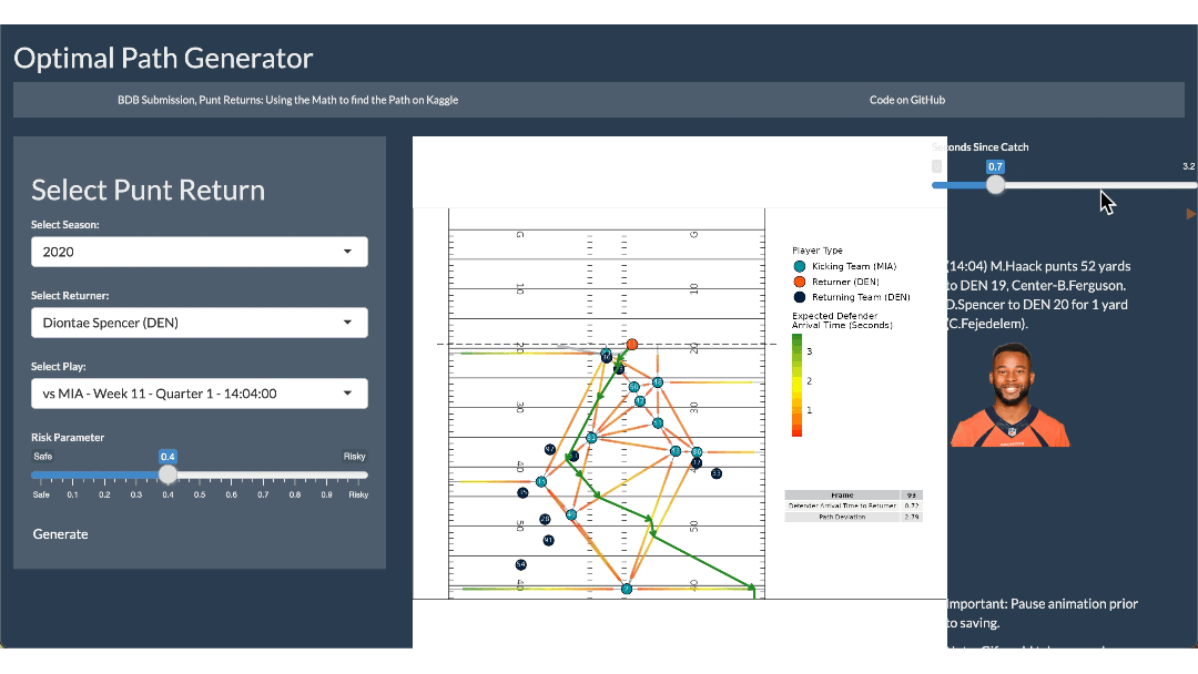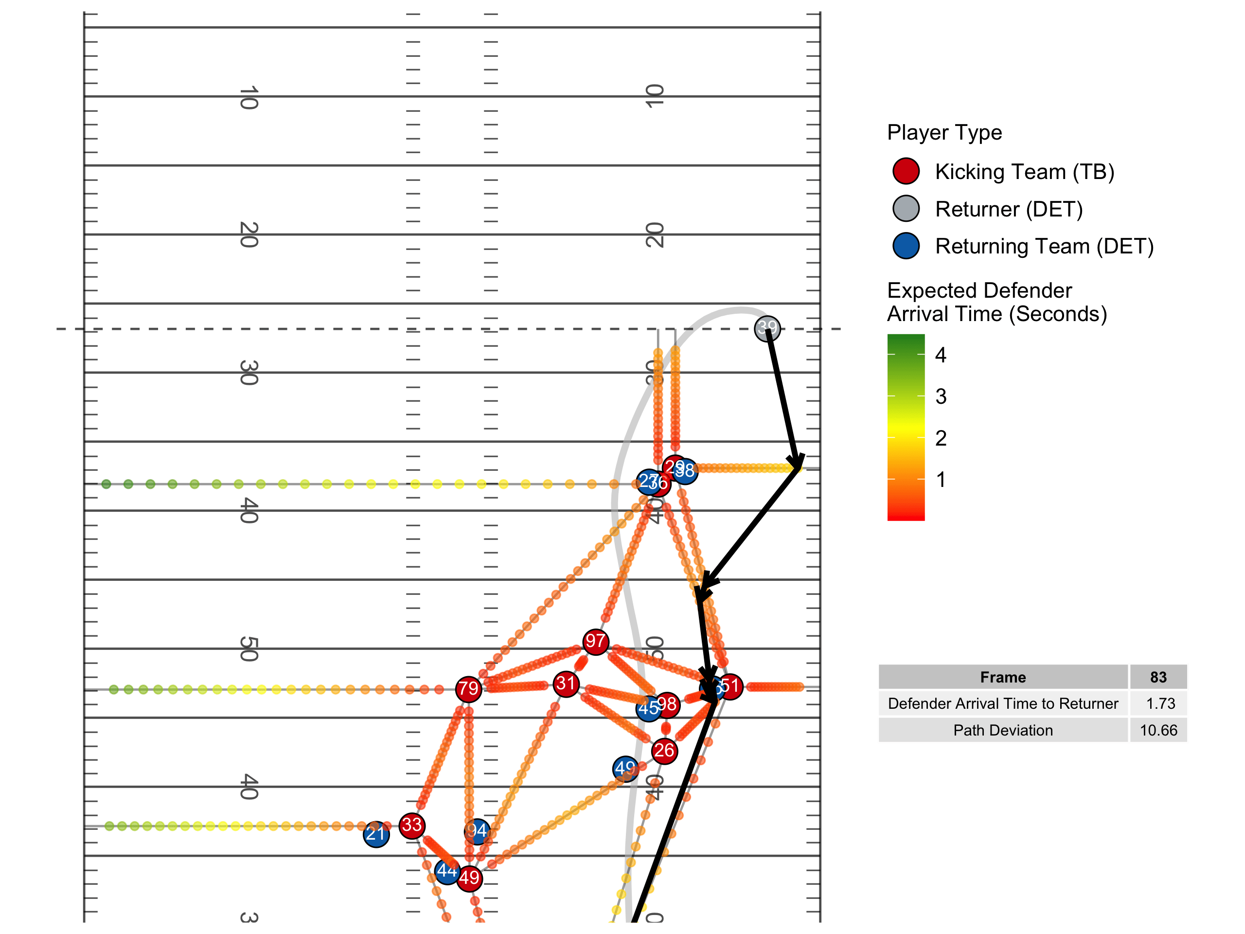 The 2022 NFL Big Data Bowl called on contestants to devise new ways to analyze special teams in the NFL. The 2022 winners focused on quantifying the decision-making ability of the punt returner in each play by constructing an algorithm that determines their optimal path at any given frame. They used data science to answer questions like: