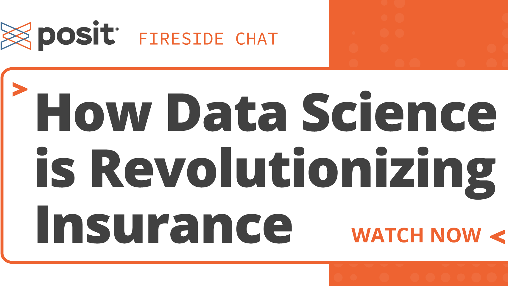 Hear from insurance leaders Kshitij Srivastava, Adam Austin, Jamie Warner, and Posit Product Marketing expert Nick Rohrbaugh as they discuss the evolution of data science within heavily regulated industries.