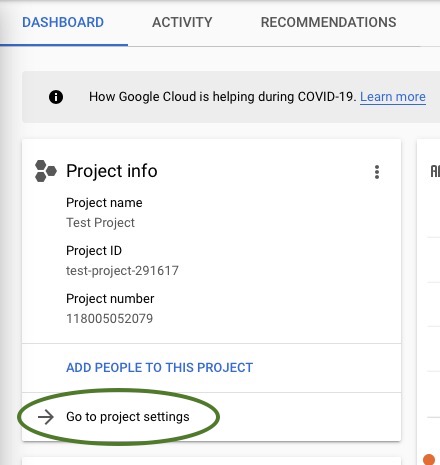 Click on Go to project settings on the Google Cloud Dashboard project card. Usually the new project’s card will be at the top left of the page and should have the project name and number. You’ll now go to your project settings page to create a service account to access this project.