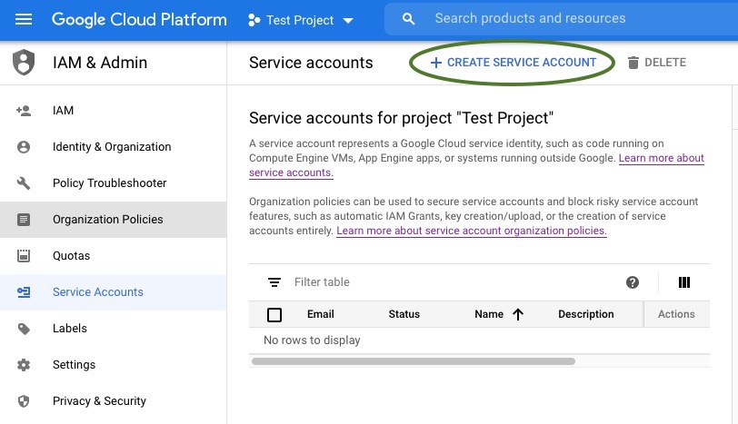 Select Create Service Account. You now have a project created, but you don’t yet have a Google user account that can be used with that project. We’ll create that on the Service Account Details screen.