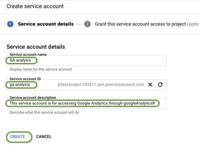 Give your service account a name. The name will automatically populate the Service Account ID field. Record the full Service Account ID generated somewhere; we’ll need to register that account with your Google Analytics administrator. It’s also a good idea to provide a long description of what you intend to do with this account. When you’ve finished with filling in these fields, click Create.