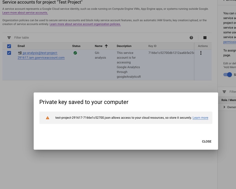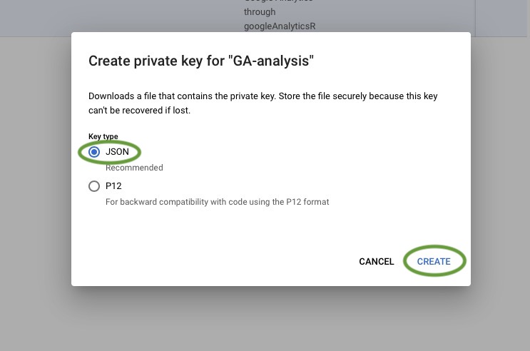 Select JSON as your key format. The googleAnalyticsR package requires the key to be in JSON format. Once you’ve selected that format, click Create.