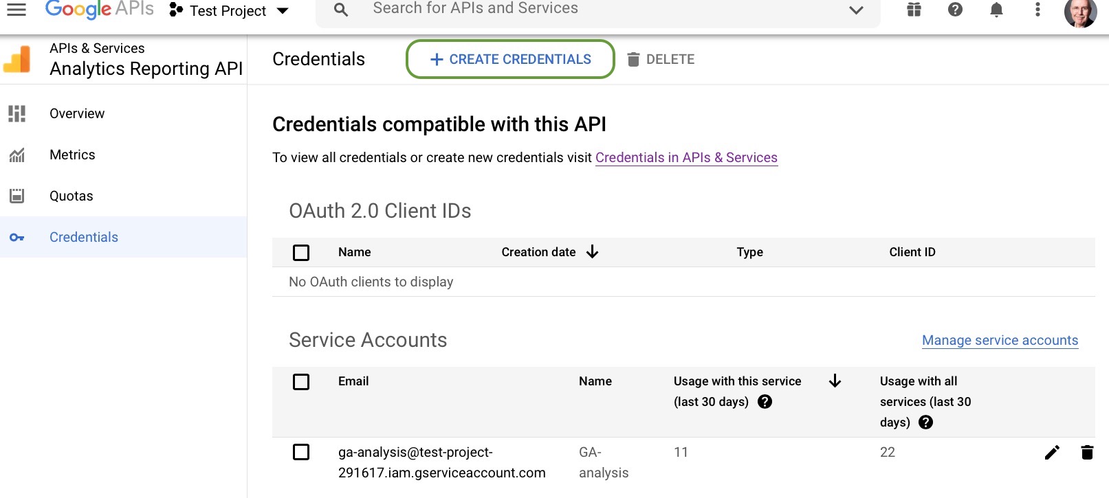 Go to the site https://console.developers.google.com/apis/api/analyticsreporting.googleapis.com/. Please note that this is not the Google Cloud API dashboard we went to in Step 3; this is the Google Analytics Report API dashboard. You probably will have no OAuth 2.0 client IDs shown. Click on + CREATE CREDENTIALS at the top of the page.