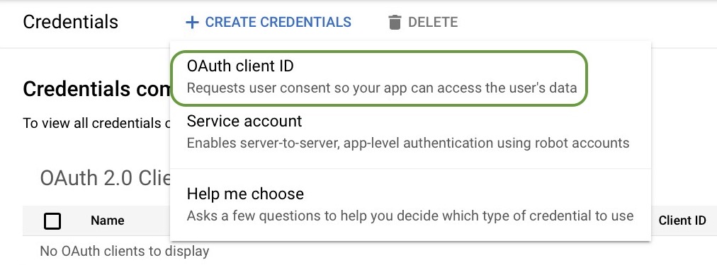 Select OAuth client ID as the credential you wish to create.