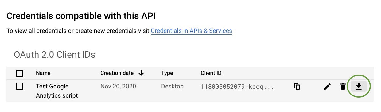 Step 5: Create and download your project’s OAUTH credentials from Google. This step will no longer be required after the new version of googleAnalyticsR is available on CRAN (see Important Update notice at the beginning of this section)