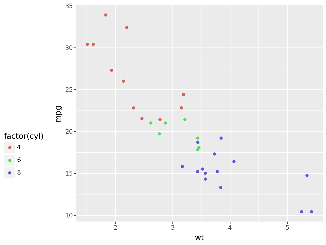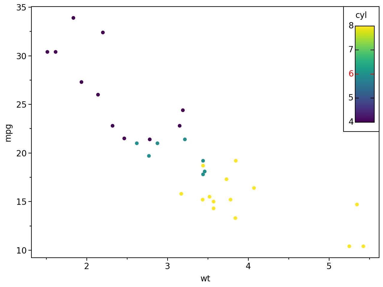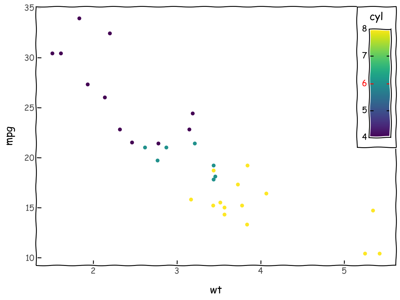 colors = ["black", "black", "red", "black", "black"]colors_doubled = [c for c in colors for i in (1, 2)](ggplot(mtcars, aes("wt", "mpg", color="cyl"))+ geom_point()+ theme_xkcd()+ theme( legend_position=(1, 1), legend_title=element_text(ha="center"), legend_text_position="left", legend_text_colorbar=element_text(color=colors), legend_ticks=element_line(color=colors_doubled), legend_background=element_rect(color="black"), legend_box_margin=5, legend_frame=element_rect(), ))