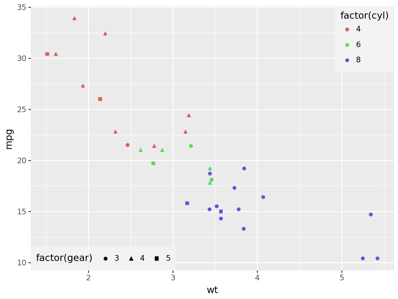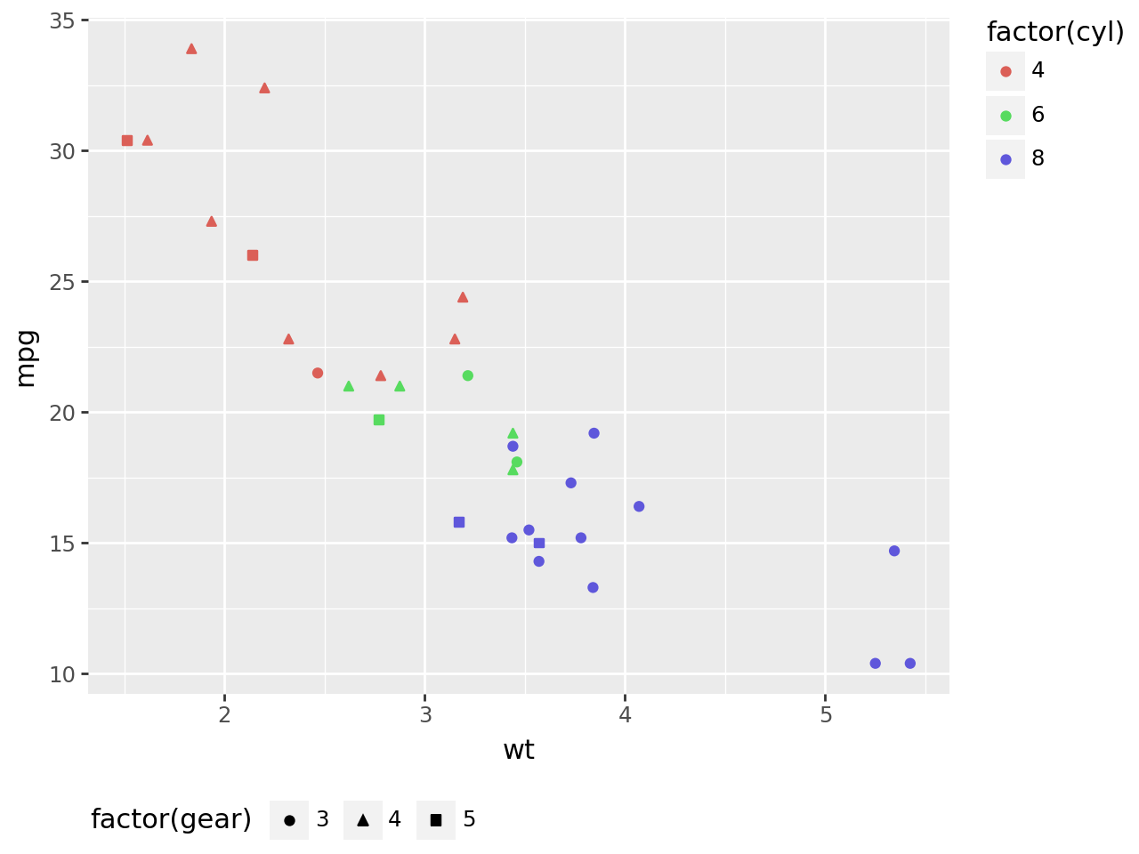 (ggplot(mtcars, aes("wt", "mpg", color="factor(cyl)"))+ geom_point(aes(shape="factor(gear)"))+ guides(shape=guide_legend(position="bottom", direction="horizontal"))+ theme( legend_justification_right="top", # This is the same as, 1 legend_justification_bottom="left", # This is the same as, 0 ))