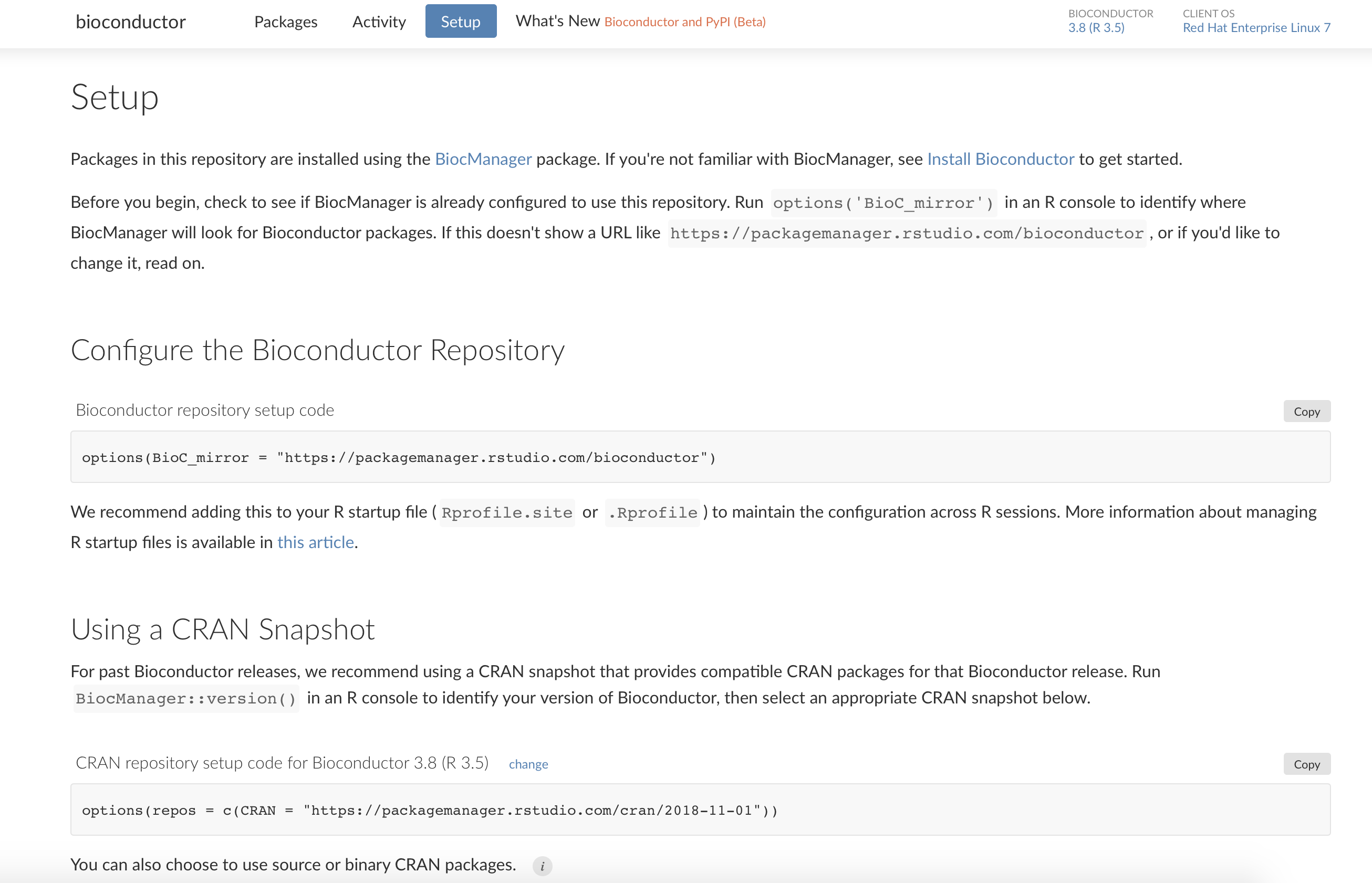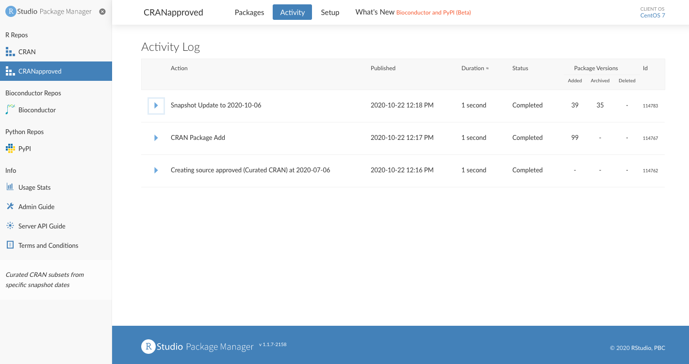 1.2.0 adds first class support for Bioconductor, an ecosystem of R packages used in the life sciences. This release makes it possible for data scientists in regulated or restricted environments to install and manage Bioconductor, even in environments without direct internet access. Teams can access Bioconductor packages using the BiocManager client, or they can use install.packages. Bioconductor packages can be combined with local packages and CRAN packages seamlessly. Package Manager also makes Bioconductor analyses more reproducible, by helping combine a Bioconductor release with a corresponding CRAN snapshot. You no longer have to manually manage incompatibilities between older Bioconductor releases and rolling CRAN updates.