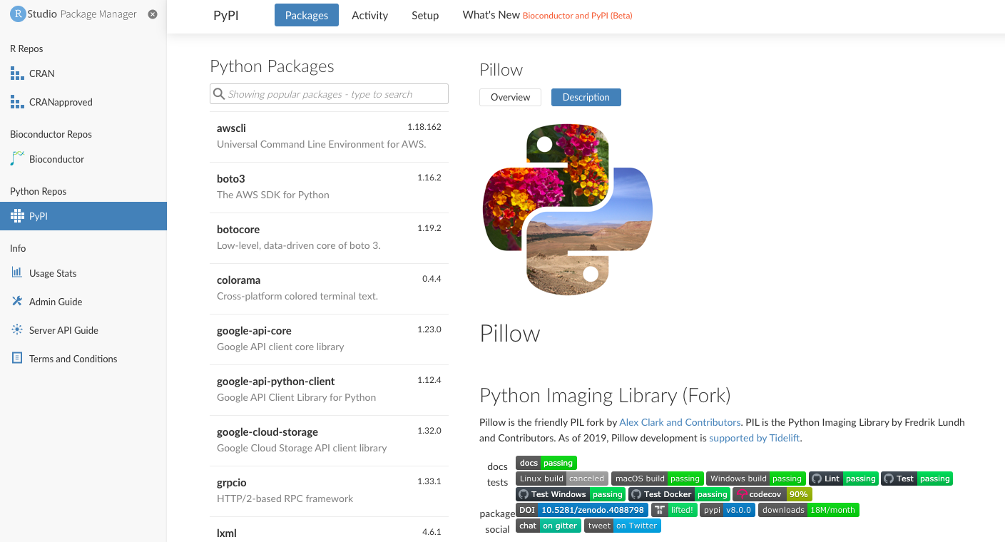 This release adds beta support for mirroring Python packages from PyPI. By adding PyPI support, we intend to make it much easier for multilingual teams to work together, and mitigate the challenges IT organizations face in maintaining their own PyPI mirrors. One exciting capability of Package Manager’s PyPI support is the addition of PyPI snapshots, enabling teams to time travel in Python just like they can in R. You can also search for Python packages explore documentation, and track package downloads. Package Manager is fully compatible with pip and tools like virtualenv and pyenv.