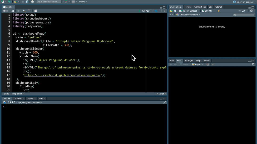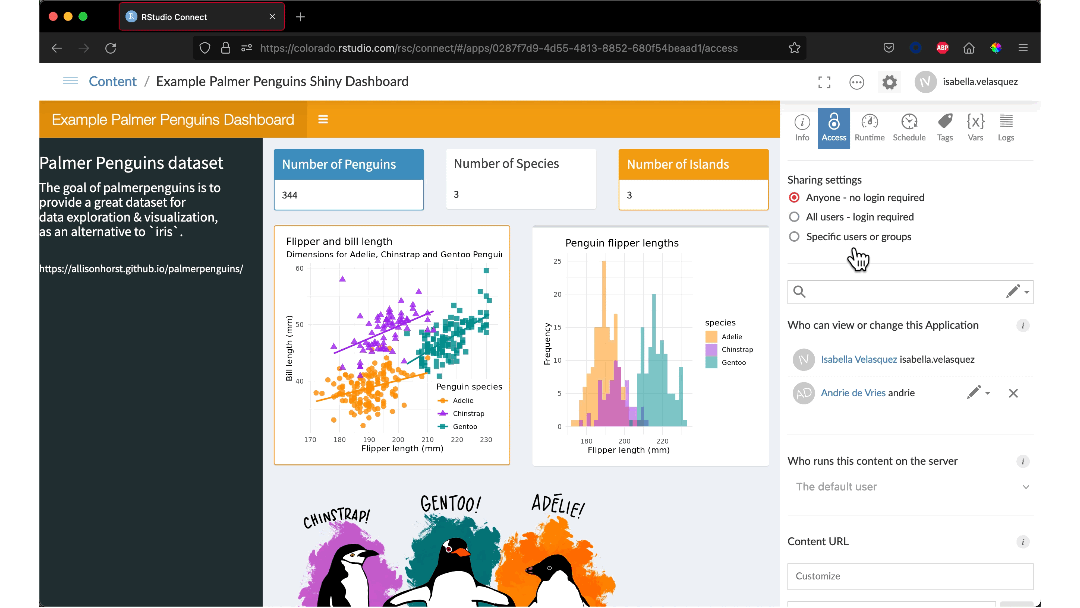 Let’s explore RStudio Connect with a dashboard using the Palmer Penguins data. Check out the dashboard on Posit Connect.