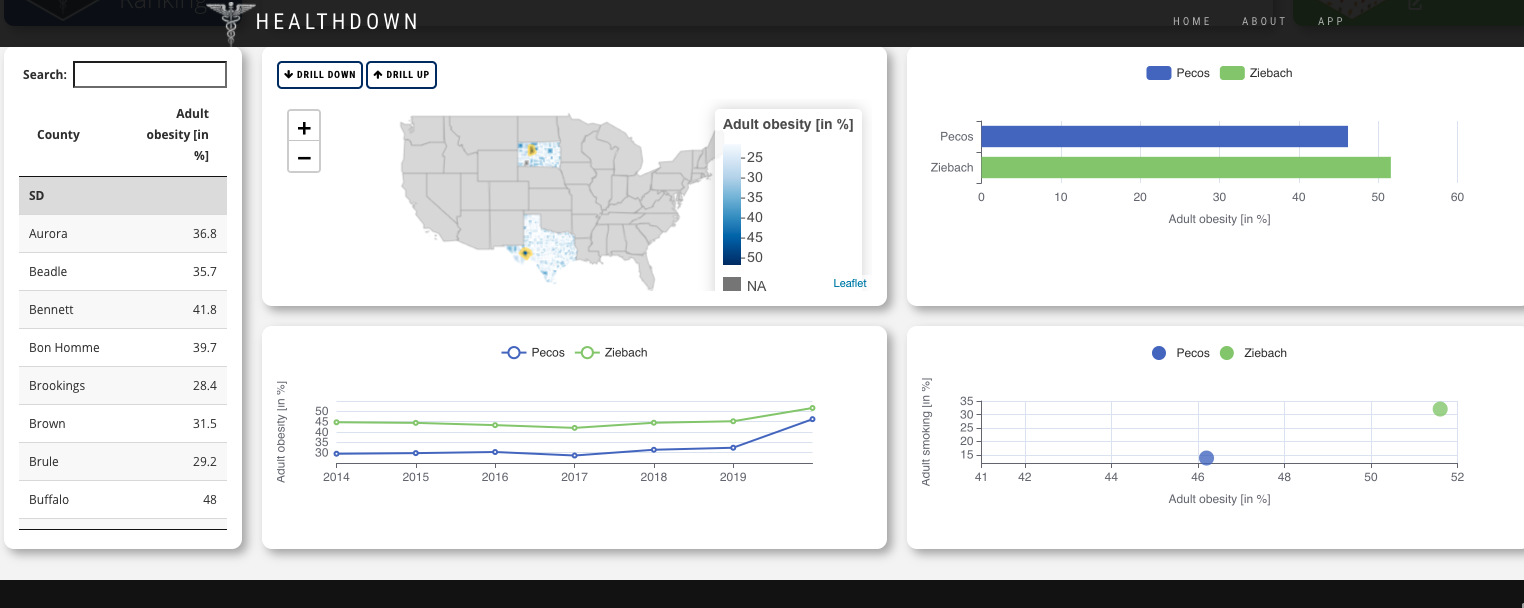 The healthdown application won an honorable mention in the 2021 Shiny Contest and shows a great new way to interactively explore health metrics spatially. The app allows users to explore the University of Wisconsin Population Health rankings. The team uses the leafdown package to give users a lot of flexibility to drill down and explore direct comparisons across different states and counties.